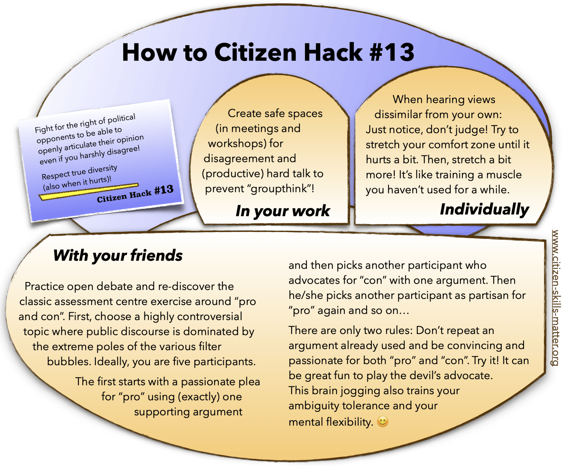 2023 hasn’t been much different than the years before: Whatever the topic that creates (always too much) outrage, quickly two extreme poles emerge, radicalise each other, squeeze out any position in between and take the society hostage. Both sides believe in remarkable symmetry that they themselves would have the right mindset and that solely people on the other side would be populist or even extremist: Worker or top manager, uneducated or professor, left or right, progressive or conservative, all seem to believe that only “the others” have to change. No “noticing without judging”! No self-doubts whatsoever! Already in recent years, I have dedicated my New Year wishes to “Citizen Skills Matter” (e.g. “ dealing with ethical dilemmas ”, “ fighting for the rights of political opponents ”, and “ citizens in developed countries and their lack of VUCA resilience ”). Last spring, when the polarisation in society began to also impact my mediation assignments and democracy salons, I decided to go back methodically and put a “citizen hack” from my very first negotiation training in 1992 in the centre again: “Let’s learn again to be able to take (multiple) positions instead of (quickly) taking a side! Conflict resolution and democracy don’t work without.”