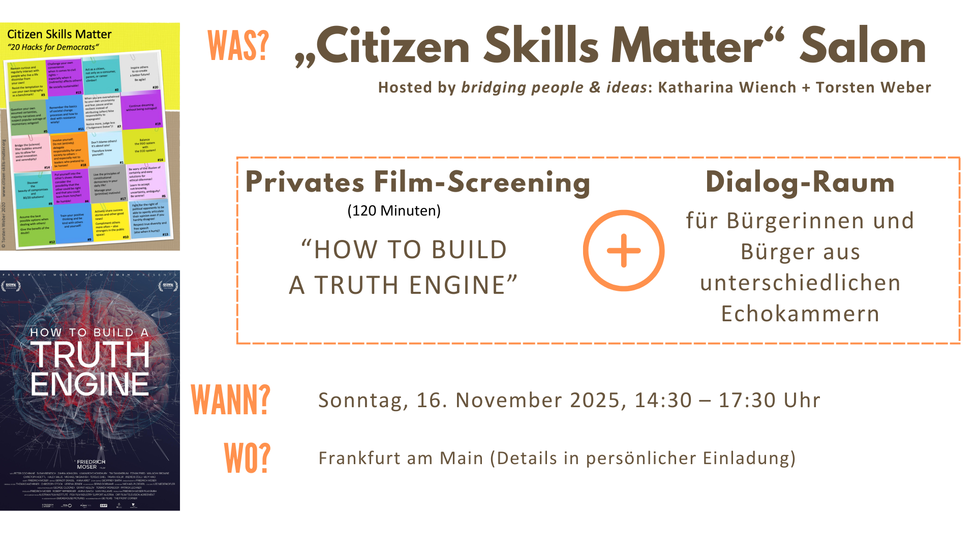 Seit 2002 folgen wir unserer Berufung, die Filterblasen einer polarisierten Gesellschaft konstruktiv zu vernetzen. Als wir vor 2 Wochen auf einer Konferenz Friedrich Moser kennen lernten, den Regisseur des Films „How to build a truth engine“ ( Trailer ), war uns sofort klar, dass wir diesen großartigen Film als Inspiration und Katalysator für einen offenen Dialog rund um „Citizen Skills Matter“ nutzen wollen. Zu den folgenden Fragen und zu den vielen anderen, die möglicherweise getriggert werden: Welche Gesellschaft wollen wir Bürgerinnen und Bürger mithelfen zu gestalten? Welche Rollen spielen dabei „Wahrheiten“? Sind sie hilfreich oder gefährlich oder beides? Wie gehen wir mit den zahlreichen, sich überlappenden Ambiguitäten in unseren Gesellschaften um? Welche Demokratie-Muskeln kann, sollte oder muss jede/r von uns selbst trainieren? Für diesen Zweck werden wir einen kleinen „Pop-up-Kino-Dialog-Space“ schaffen. Es gibt kein Podium, kein Panel, keine Hierarchie. Sondern Bürgerinnen und Bürger auf Augenhöhe, die einander aktiv zuhören, ohne vorschnell zu bewerten. Die ihre Selbstgewissheit zügeln und den Zweifel zulassen. Und die vielleicht sogar lustvoll spekulieren und Spaß haben. In gewisser Weise halt ein Labor emergenter Demokratie. ๐ Das „Tokonoma“ mit seinem innovativem Unternehmer-Team ist dafür ein toller Ort: “Not a venue. A living system where music, design, and community meet.” Wir haben Menschen verschiedener Filterblasen aus dem Rhein-Main-Gebiet eingeladen. Solltet Ihr woanders leben, aber am 16. November in Frankfurt sein können, meldet Euch bitte bei uns. Für diese geographische Diversität haben wir ein kleines Kontingent reserviert. Wir freuen uns riesig auf die Zeit mit Euch! Eure Katharina und Torsten