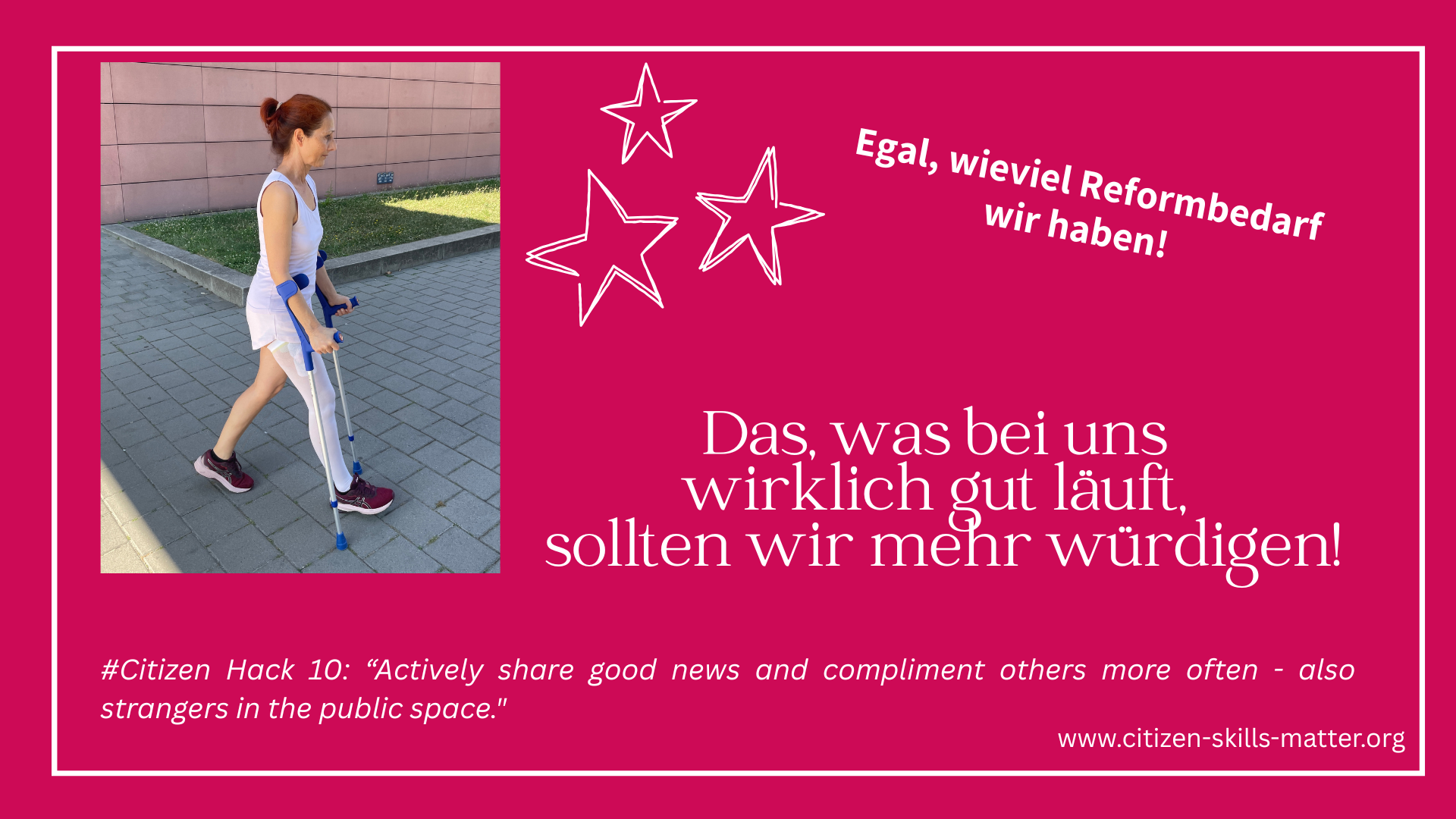 Ein Tag im Juni 2025 in Frankfurt am Main. Ich bin gerade auf dem Weg zum Bahnhof. Eiligen Schrittes und vielleicht einen Moment zu unachtsam für das holprige Kopfsteinpflaster. Ich stolpere und falle auf den Boden. Mein Oberschenkel macht "Krack". Danach: Krankenwagen, Blaulicht, Unfall-Klinik, OP... "Was für ein Unglück!" sagte meine Nachbarin ein paar Wochen später. "Du bist doch noch viel zu jung für so einen Unfall!" Natürlich hat sie Recht. Ein Unglück. Einerseits . Weil, hey, ich kann immer noch kein Rad fahren und habe immer noch Schmerzen beim Laufen. Das ist selbst für meine vergleichsweise stark ausgeprägte Resilienz eine Prüfung! ;-) Andererseits . Was hatte ich für ein Glück! Die Schmerzen werden vergehen. Und viele gute und wichtige Erfahrungen werden bleiben: ๐ค Ich habe den Krankenwagen gerufen. Die DRK-Rettungssanitäter waren großartig! Extrem mitfühlend, hilfsbereit, die Ruhe selbst und absolut professionell! ๐ค In der Unfallklinik Frankfurt, in die man mich brachte und in der ich operiert und einige Tage lang wirklich gut versorgt wurde, konnte ich den Alltag hautnah erleben. ๐ค Wo kann man heutzutage besser erleben, wie relevant die Diversität unserer Zuwanderungsgesellschaft in Deutschland ist als in einem öffentlichen Krankenhaus? Wo wären wir ohne all die engagierten Ärzt:innen, Pfleger:innen, Physiotherapeut:innen, Reinigungskräfte, Servicekräfte..., die ihre Wurzeln auf der ganzen Welt haben? ๐ค Wo trifft man auch auf Seite der Patient:innen alle gesellschaftlichen Schichten und alle kulturellen Hintergründe? ๐ค Und wo kann man noch beobachten, dass trotz aller unstrittigen Defizite, die es im Gesundheitssystem, in Krankenhäusern und der Gesellschaft gibt, ein Arbeiten "Hand in Hand" über Sprach- und Kulturgrenzen hinweg so gut funktioniert? Und in dem nicht zuerst gefragt wird, wer Du bist und was Du hast, bevor man Dir hilft. ๐ค Und auch nach meinem Krankenhausaufenthalt wurde ich oft von der Hilfsbereitschaft und Empathie mir wildfremder Menschen positiv überrascht! Übrigens auch in meinem Kiez, dem Frankfurter Bahnhofsviertel, wo die Hilfsbereitschaft traditionell größer ist als anderswo in der Stadt. Ich weiß jedenfalls, dass ich ohne die mitfühlende Hilfe und den Zuspruch all dieser vielen Menschen heute noch nicht wieder so gut zu Fuß wäre. DANKE Euch Allen!! Es braucht oft gar nicht so viel, um unseren Mitmenschen zu zeigen, dass sie nicht alleine sind, und um ihnen Mut zu machen, mit "persönlichen Herausforderungen" besser fertig zu werden. Außerdem können wir damit alle selbst jeden Tag die Welt ein kleines bisschen besser machen! #CitizenHack10 “Actively share good news and compliment others more often - also strangers in the public space." #machenstattmeckern #citizenskillsmatter #Bahnhofsviertel #UniklinikFrankfurtamMain, #UniversitätsmedizinFrankfurt #Rettungssanitäter:innen #DeutschesRotesKreuz