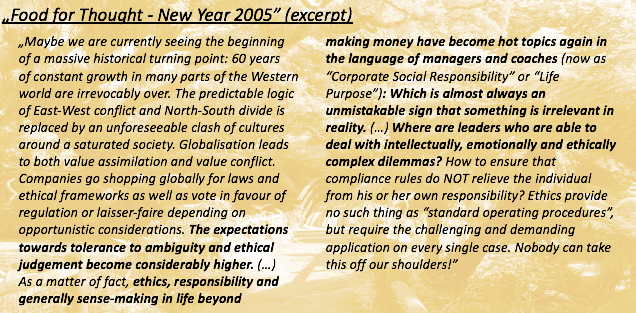 Dear friends, Since 2005, I regularly send some food for thought on the first day of the New Year. Today, I make my life easy and simply recycle an excerpt of that first year (see attachment). It is somehow too striking how the discourse of the late 1980s and the mid-2000s currently repeats itself again: The zeitgeist obviously took a break, but now we experience once again the ubiquitous renaissance of the search for direction and sense in life – this time camouflaged in the “purpose” narrative. Are we ready this time to reduce our own short-term benefits in concrete decisions if the social or environmental impact on the collective is much higher? Or is “purpose” yet another monstrance which we parade with to escape those uncomfortable questions around our own conduct of life? And will we ask ourselves these very same questions in 15 years because we have only conveniently scratched the surface of our bourgeois existence again? I wish you (and your families) in the coming year truly bold decisions when dealing with ethical dilemmas. Best wishes, Torsten