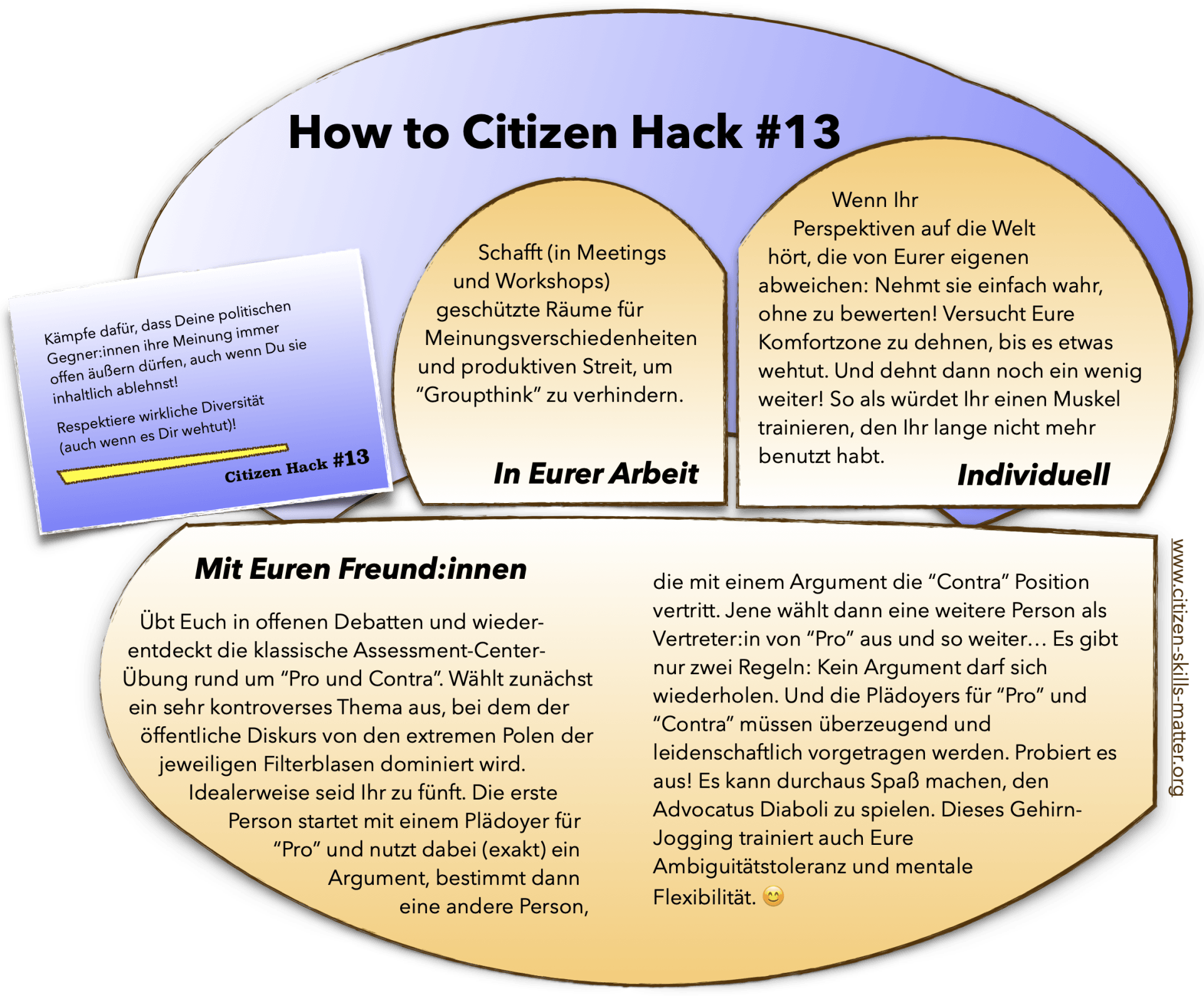 2023 hasn’t been much different than the years before: Whatever the topic that creates (always too much) outrage, quickly two extreme poles emerge, radicalise each other, squeeze out any position in between and take the society hostage. Both sides believe in remarkable symmetry that they themselves would have the right mindset and that solely people on the other side would be populist or even extremist: Worker or top manager, uneducated or professor, left or right, progressive or conservative, all seem to believe that only “the others” have to change. No “noticing without judging”! No self-doubts whatsoever! Already in recent years, I have dedicated my New Year wishes to “Citizen Skills Matter” (e.g. “ dealing with ethical dilemmas ”, “ fighting for the rights of political opponents ”, and “ citizens in developed countries and their lack of VUCA resilience ”). Last spring, when the polarisation in society began to also impact my mediation assignments and democracy salons, I decided to go back methodically and put a “citizen hack” from my very first negotiation training in 1992 in the centre again: “Let’s learn again to be able to take (multiple) positions instead of (quickly) taking a side! Conflict resolution and democracy don’t work without.”