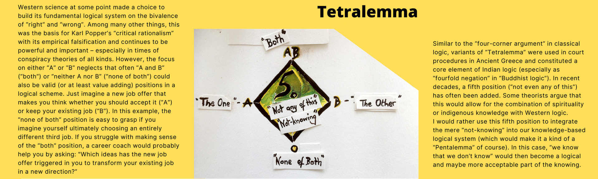 When I was young, one of my life teachers left a piece of advice with me: “Embrace not-knowing, confusion, and helplessness as our best mentors in life!” It took a long time for me to fully understand the wisdom of his words. And even longer until I transformed the essence into one of my “20 Citizen Hacks” : “Be wary of the illusion of certainty and easy solutions for ethical dilemmas! Learn to accept not-knowing, uncertainty, ambiguity! Be serene!“ Today, I am even more convinced that we as a society need this fundamental citizen skill to handle ethical dilemmas and to mediate holistic trade-offs between extreme positions sustainably. For 15 years now, the “Tetralemma” model helps me to continuously train my ambiguity tolerance and to be able to stand two (seemingly) opposing truths at the same time – intellectually and emotionally. I am happy to share my very personal “Nutshell Summary for Busy People”. ๐